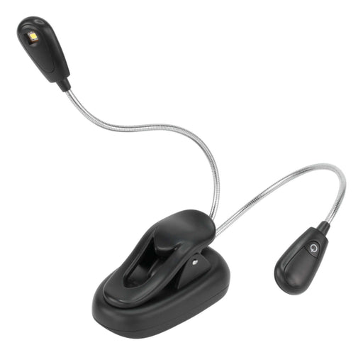 Kleine und handliche LED-Lampe mit zwei Schwanenhälsen zur lesefreundlichen Ausleuchtung von unterschiedlichen Medien wie Bücher, Notenblätter, Zei...