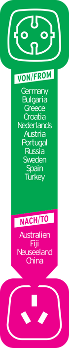 - Reiseadapter zum Anschluss elektrischer Geräte mit Schutzkontakt-Stecksystem in Ländern mit Stecksystem Australien, China